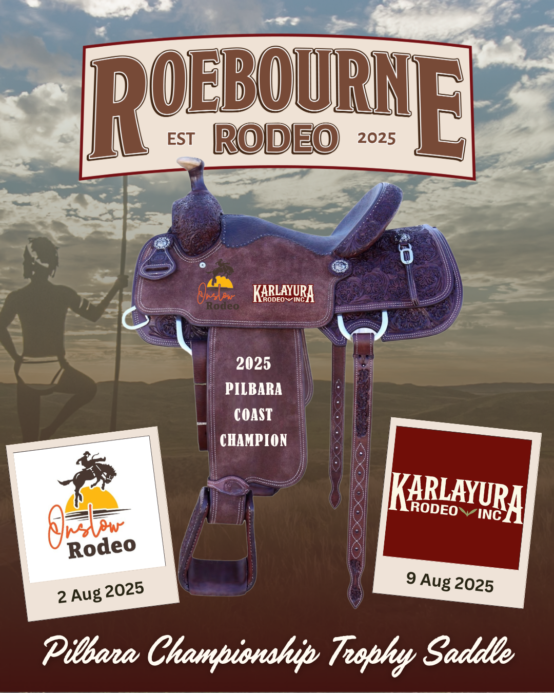Karlayura Rodeo Inc. & Onslow Rodeo Club are teaming up to bring you the ULTIMATE rodeo prize the 2025 Pilbara Coast Championship Trophy Saddle! This prestigious award will go to ONE outstanding competitor who dominates the arena in both Onslow Rodeo (Aug 2, 2025) & Roebourne Rodeo (Aug 9, 2025).